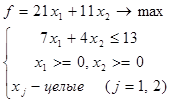 Этот метод точного решения ЗЦЛП чаще всего используется на практике. Он состоит в следующем. Сначала решается ослабленная задача. Если полученное оптимальное решение целочисленное, то ЗЦЛП решена. Если же оптимальное решение ЗЛП не является целочисленным, то производим "ветвление" следующим образом. Пусть переменная хs приняла в оптимальном решении значение qs, которое не является целым. Тогда рассматриваем две ЗЦЛП. Первая получается добавлением ограничения хs <=[qs], вторая – добавлением ограничения хs >=[qs] + 1, где [qs] - целая часть числа qs. Каждая из этих двух задач аналогичным образом может разбиться еще на две задачи т.д. Если в результате решения какой-либо из задач получается целочисленный оптимальный план, то значение А целевой функции при этом плане играет роль "границы": если в результате решения очередной ЗЛП выяснится, что оптимальное значение целевой функции "хуже" А, то такая задача "не ветвится". Недостаток метода ветвей и границ состоит в том, что часто оптимальное решение ЗЦЛП достигается после очень большого числа ветвлений. Вернемся к ЗЦЛП примера 1.