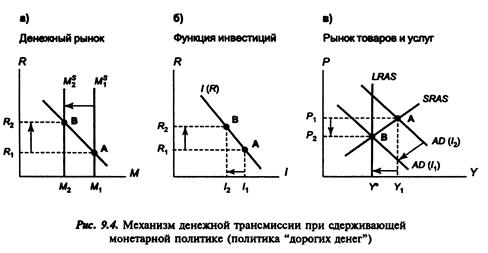 Таким образом, воздействие монетарной политики происходит в краткосрочном периоде и направлено на сглаживание циклических колебаний экономики (стабилизации экономики) путем воздействия на совокупный спрос с помощью изменения величины предложения денег Центральным банком. Воздействие монетарной политики на экономику. Рассмотрим, каким образом изменение предложения денег оказывает воздействие на экономику. Механизм, который показывает, как изменение ситуации на денежном рынке влияет на изменение ситуации на рынке товаров и услуг (реальном рынке) носит название «механизма денежной трансмиссии» или «денежного передаточного механизма» («money transmission mechanism»). Связующим звеном между денежным и товарным рынком выступает ставка процента. Равновесная ставка процента формируется на денежном рынке по соотношению спроса на деньги и предложения денег. Изменяя величину предложения денег, Центральный банк может влиять на ставку процента. Зависимость между ставкой процента и предложением денег обратная. Если предложение денег уменьшается, ставка процента растет (рис.9.1 (а)). Если предложение денег увеличивается, ставка процента падает (рис.9.1 (б)). Ставка процента, являясь ценой заемных средств (ценой кредита), воздействует на инвестиционные расходы фирм. Чем выше ставка процента, тем меньше кредитов будут брать фирмы, и тем меньше будет величина совокупных инвестиционных расходов и поэтому меньше объем выпуска.