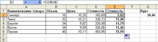 Рис. 16.12. Использование абсолютных ссылок Для того чтобы ссылка на ячейку при копировании не изменялась, необходимо использовать абсолютные ссылки. Абсолютная ссылка на ячейку имеет формат $A$1. Чтобы ссылка на ячейку была абсолютной при создании формулы, после указания ссылки на ячейку следует нажать клавишу клавиатуры F4. Ссылку можно преобразовать из относительной в абсолютную и при редактировании ячейки с формулой. Для этого к заголовкам столбца и строки в адресе ячейки следует добавить символ $. Например, для того чтобы ссылка на ячейку G2 стала абсолютной, необходимо ввести $G$2. Абсолютными ссылками по умолчанию являются имена ячеек. Ссылка может быть не только относительной или абсолютной, но и смешанной. Ссылка формата A$1 является относительной по столбцу и абсолютной по строке, т.е. при копировании ячейки с формулой выше или ниже, ссылка изменяться не будет. А при копировании влево или вправо будет изменяться заголовок столбца. Ссылка формата $A1 является относительной по строке и абсолютной по столбцу, т.е. при копировании ячейки с формулой влево или вправо выше или ниже ссылка изменяться не будет. А при копировании выше или ниже будет изменяться заголовок строки. Например, в ячейке Е2 таблицы на рис. 16.12 достаточно было ввести смешанную ссылку G$2.