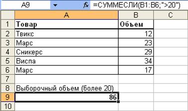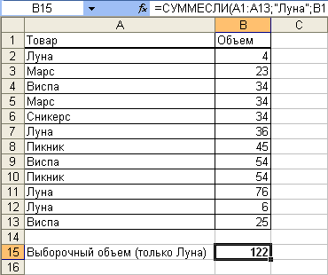 Рис. 17.14. Выборочное суммирование с использованием функции "СУММЕСЛИ" Можно суммировать значения, относящиеся к определенным значениям в смежных ячейках. Например, в таблице на рис. 17.15 суммированы только объемы партий, относящиеся к товару "Луна".