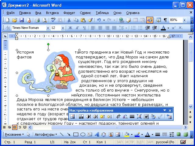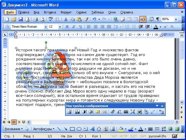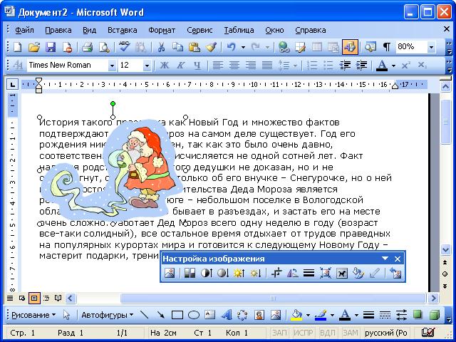 Для установки обтекания текстом необходимо нажать кнопку Меню "Обтекание текстом" панели инструментов Настройка изображения (рис. 23.11). При этом появится меню, в котором можно выбрать один из стилей обтекания: Вокруг рамки (см. рис. 23.6), По контуру (рис. 23.12), За текстом (рис. 23.13), Перед текстом (рис. 23.14) или другой.