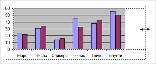 Можно изменить размеры только некоторых элементов диаграммы. Чтобы изменить размер Области построения диаграммы, ее следует выделить (при этом вокруг области появится штриховая рамка), а затем буксировать маркеры области. Например, для изменения размера по горизонтали необходимо перетащить маркер вертикальной границы (рис. 28.6). Для изменения размера по вертикали необходимо перетащить маркер горизонтальной границы. Для изменения размера сразу в двух направлениях необходимо перетащить угловой маркер.