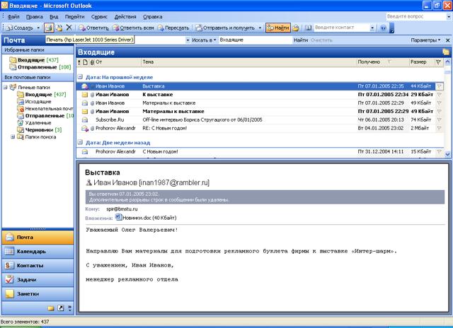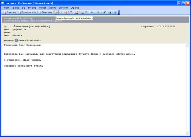 Рис. 34.2. Печать сообщения электронной почты Для настройки параметров печати необходимо выделить сообщение в списке сообщений и выполнить команду Файл/Печать. В диалоговом окне Печать (рис. 34.3) в разделе Стиль печати выбрать Заметки, после чего нажать кнопку Параметры страницы.