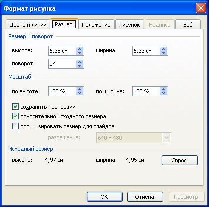 Рис. 36.16. Установка размера рисунка во вкладке "Размер" диалогового окна "Формат рисунка"