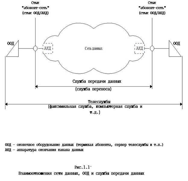 Под структурой сети принимают совокупность элементов сети и связи между ними. Учитывая тот факт, что СДЭС является большой системой, можно декомпозировать сеть на составные части по нескольким критериям, т.е. можно говорить о логической структуре сети, о физической структуре, об организационно-технической структуре, об эталонной структуре и т. п. Сети ПД не включают в себя оконечное оборудование данных (ООД). Соответственно, службы ПД не включают в себя функции ООД. Рекомендуемое Международным союзом электросвязи (МСЭ) в Рекомендации F.600 взаимоотношение ООД и службы ПД показано на рис.1.1*. В указанных выше РД не устанавливаются требования к внутреннему устройству сетей данных. Могут применяться различные сетевые архитектуры, типы и иерархии сетевых узлов. Они могут выбираться операторами сетей при условии соблюдения требований РД В основе каждой возможной структуры лежит некоторая модель, учитывающая состав элементов, существенных для описания СДЭС по выбранному критерию. Логическая структура показывает основные элементы СДЭС, определяющие принцип ее функционирования (Рис.1.2).