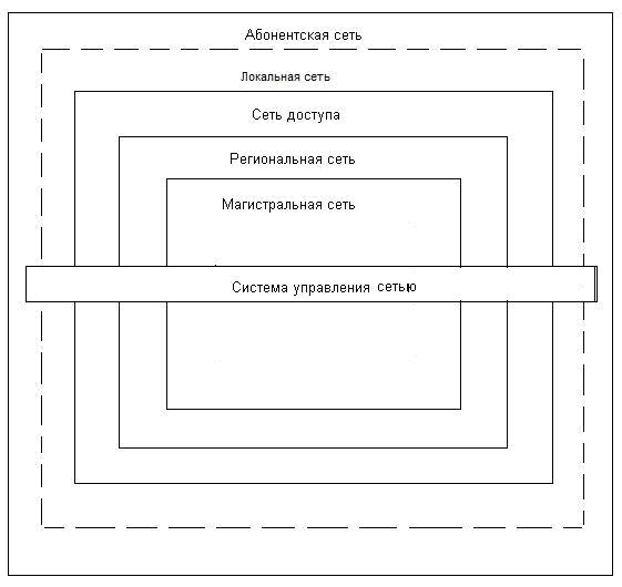 Элементами данной модели являются терминалы пользователей, транспортная подсистема, включающая каналы и центры коммутации и средства реализации телеуслуг, поставляемых сетью. Реализация основных функций сети контролируются подсистемой управления. Модель физической структуры сети (рис.1.3) раскрывает совокупность средств, обеспечивающих обмен сообщениями в сети. Эти средства образуют абонентские сети, сети доступа, региональные сети, магистральные сети. Более подробно функции этих сетей по обеспечению обмена сообщениями будут раскрыты при рассмотрении функционирования конкретных сетей документальной электросвязи.