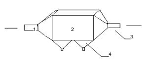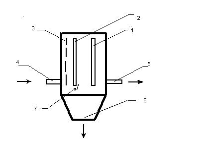 Електрофільтр 1 – коронуючий електрод; 2 – осаджувальний електрод; 3 – газорозподільна решітка; 4 – вхідний патрубок; 5 – вихідний патрубок; 6 – бункер видалення пилу (шламу); 7 – механізм струшування пилу.