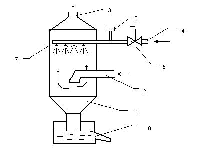 Форсунковий скрубер 1 – циліндричний корпус; 2 – вхідний патрубок; 3 – патрубок для виходу очищеного газу; 4 – підведення води на форсунки; 5 – регулюючий вентиль; 6 – контроль параметрів води; 7 – форсунки розпилення води; 8 – ємність для забрудненої води. Форсунковий скрубер складається з циліндричної ємкості з патрубками для підводу і відводу повітря. У верхній частині корпусу розміщені один або декілька ярусів форсунок для розпилення рідини. Рідина і вигляді дощу з діаметром краплин 0,6 – 1 мм якби промиває газ, який рухається назустріч, тобто знизу доверху зі швидкістю 0,7-1,5 м/с. Тверді частинки пилу, підхоплені краплинами води, потрапляють донизу, в бункер, звідки видаляються разом з водою назовні. Витрати води в скрубері – 1-6 л/м3 . Використовують також механічні скрубери,в яких розпилення води відбувається за допомогою металевого диска, що швидко обертається. Також широко використовуються відцентрові скрубери. Принцип дії і конструкція відцентрового скрубера аналогічні циклону. Під дією відцентрової сили, що виникає під час обертання газового потоку в апараті, частинки пилу відкидаються на стінки скрубера, звідки змиваються водою, яка подається крізь сопла, що розміщені по колу у верхній частині корпусу апарата. Швидкість газового потоку в апараті сягає 4-5 м/с, ступінь очищення досить висока і залежить від розміру і щільності частинок пилу, а також від діаметру скрубера. Серед апаратів мокрого очищення газів ударно-інерційної дії найбільш поширені пиловловлювач вентиляційний мокрий (ПВМ) і ротоклон. Апарати мокрого очищення газів ударно-інерційної дії використовують, якщо немає достатньої кількості чистої води, для очищення газу від частинок пилу розміром не менше 5-10мкм при відносно невисоких температурах газу.
