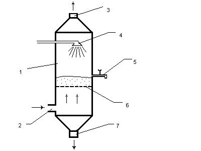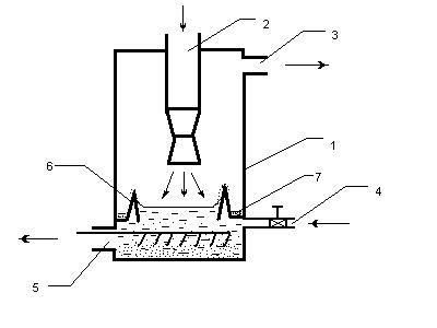 Барботажний абсорбер 1 – корпус апарату; 2 – вхід забрудненого газового потоку; 3 – вихід очищеного газу; 4 – розпилювач сорбенту (поглинальної рідини); 5 – відведення відпрацьованої рідини; 6 – решітка; 7 – відведення відпрацьованої рідини, яка просочилась крізь решітку.