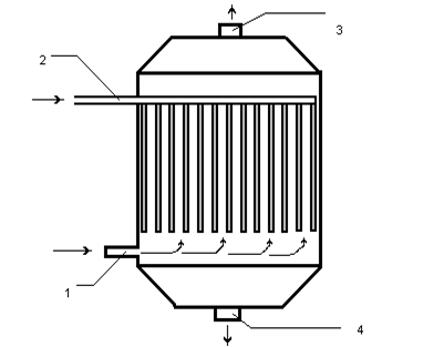 Плівковий абсорбер 1 – вхід забрудненого газового потоку; 2 – підведення рідкого абсорбенту; 3 – вихід очищеного газового потоку; 4 – вихід використаного абсорбенту.