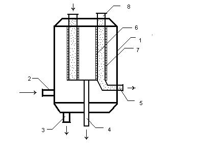 Кільцевий адсорбер 1 – корпус; 2 – штуцер вводу забрудненого газу; 3 – штуцер виходу парогазової суміші; 4 – штуцер виходу очищеного газу; 5 – патрубок для виходу використаного адсорбенту; 6 – внутрішня циліндрична решітка; 7 - зовнішня циліндрична решітка; 8 – люк для завантаження адсорбенту.