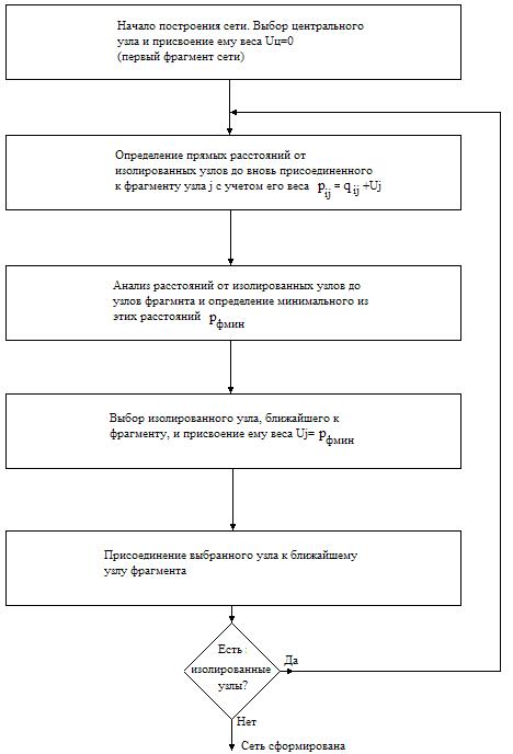 Присоединенному узлу j приписывается вес Uj, равный его расстоянию до центрального узла, а затем определяются расстояния от каждого из изолированных узлов до присоединенного: