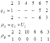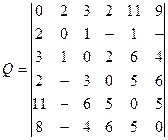 Далее анализируются расстояния от изолированных узлов до узлов фрагмента и определяется минимальное из этих расстояний. Таким образом определяется ближайший узел к фрагменту. Этот узел присоединяется к фрагменту кратчайшей ветвью. Затем вновь присоединенному узлу приписывается вес Uj, равный его расстоянию до центрального узла, определяются расстояния от изолированных узлов до присоединенного, анализируется минимальное из этих расстояний и ближайший к фрагменту узел присоединяется к нему. Эти операции продолжаются до тех пор, пока не останется ни одного изолированного узла. В результате получим кратчайшую связывающую сеть-дерево. Пример. Синтезировать сеть из восьми узлов 0,1,2,3,4,5,6,7 по заданным значениям допустимых вероятностей qij выхода из строя каналов связи между узлами, представленных в структурной матрице Q, элементы которой записаны в виде