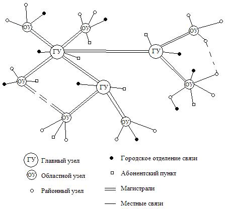 Рис.10.1 Радиально-узловой принцип. Сеть общего пользования предназначена для обслуживания широкого круга населения, а также предприятий и учреждений с небольшим телеграфным обменом. Оконечная телеграфная аппаратура в сети общего пользования устанавливается в городских районных отделениях связи и на телеграфных узлах. Телеграммы доставляются в отделения отправителями, а адресатам – службой доставки городских и районных отделений связи. Сеть абонентского телеграфирования предназначена для обслуживания ограниченного числа предприятий и учреждений. В этой сети оконечная телеграфная аппаратура находится у абонентов и все операции по передаче и приему сообщений выполняются самими абонентами. Телеграфные узлы обеспечивают абонентов оконечной аппаратурой, соединительными линиями с близлежащим узлом и производят необходимую коммутацию каналов связи. Сеть общего пользования в зависимости от вида применяемой коммутации на транзитных узлах состоит из сети с переприемом сообщений и сети прямых соединений (ПС). При радиально-узловой системе построения телеграфной сети значительные потоки телеграмм проходят несколько переприемных (транзитных) узлов. Исследования показали, что в крупных узлах обрабатывается 75-80% транзитных телеграмм. Для ускорения обработки транзитных сообщений нашли применение две системы автоматизированного переприема телеграмм: полуавтоматическая с отрывом и транспортировкой перфорированной ленты (АТОЛ) и автоматическая с кодовой коммутацией телеграмм. В сети ПС переприем телеграмм не производится, а оконечным пунктам (городским отделениям связи и районным узлам) предоставляются временные прямые телеграфные связи с любым другим оконечным пунктом сети аналогично абонентскому телеграфированию. Ведомственные сети передачи телеграфных сообщений базируются или полностью на специально создаваемых сетях связи, или частично на государственных системах связи. При организации ведомственных сетей используются принципы сетей общего пользования и абонентского телеграфирования. В частности, в зависимости от места размещения оконечной телеграфной аппаратуры телеграфная связь может быть организована по узловому или абонентскому способам. При организации телеграфной связи по абонентскому способу телеграфная оконечная аппаратура устанавливается непосредственно у абонентов, как и в сети абонентского телеграфирования. Характерная особенность узлового способа состоит в том, что оконечная телеграфная аппаратура, наряду с коммутационно-распределительной и другой аппаратурой, размещается на узлах связи. Преимуществом узлового способа является большая маневренность оконечной аппаратурой и каналами связи и наибольший коэффициент использования, как оконечной аппаратуры, так и каналов связи. Недостаток этого способа состоит в увеличении времени прохождения телеграмм, связанном с доставкой телеграмм на узел связи и обратно, в необходимости дополнительного оформления документации по прохождению телеграмм и т.п. При абонентском способе время прохождения телеграмм резко сокращается, прием телеграмм может проходить при отсутствии абонентов. Вместе с тем оконечная аппаратура, размещенная у абонентов, используется не полностью и для уменьшения числа отказов требуется разветвленная сеть кан