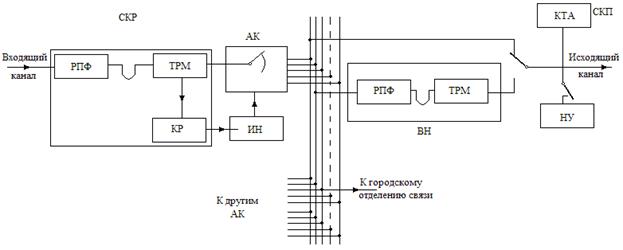 Рис.10.2.Структурная схема основного оборудования. Входящие телеграммы от смежных узлов или городских отделений связи поступают на стол кодового регистра (СКР), который состоит из реперфоратора (РПФ), трансмиттера (ТРМ) и кодового регистра (КР). Знаки принимаемой телеграммы накапливаются на перфоленте между реперфоратором и трансмиттером. Затем запускается трансмиттер на время передачи маршрутного индекса, кодовые комбинации которого поступают в кодовый регистр, после чего трансмиттер останавливается. Накопленные в КР комбинации маршрутного индекса поступают в искатель направлений ИН, который подключается к КР только на время производства коммутации. Искатель направлений дешифрует маршрутный индекс и подает соответствующие сигналы в автоматический коммутатор АК, который производит соединение СКР с каналом требуемого направления (исходящим каналом). После составления связи к исходящему каналу подключается нумеровальное устройство НУ, которое передает в канал порядковый номер телеграммы и текущее время. Затем к исходящему каналу подключается кодовый регистр, с помощью которого передаются знаки маршрутного индекса, индекса данного СКР и старого номера телеграммы, под которым она была принята по входящему каналу. По окончании передачи служебных знаков включается трансмиттер, передается текст телеграммы и знаки конца телеграммы. После этого трансмиттер останавливается, и автоматический коммутатор отключает исходящий канал от стола кодового регистра. Все передаваемые в исходящий канал сообщения печатаются на контрольном телеграфном аппарате КТА стола контроля передачи СКП. Если исходящий канал занят, то телеграммы поступают в выравниватель нагрузки ВН, с помощью которого они будут переданы, как только освободится исходящий канал. Если входящее сообщение имеет маршрутный индекс, присвоенный данному телеграфному узлу, то трансмиттер СКР передает в искатель направлений соответствующие три знака местного индекса. После их дешифрации автоматический коммутатор подключает СКР к линии требуемого городского отделения связи.