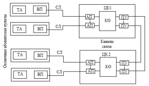 Рис.10.3Принцип организации абонентской телеграфной связи. В состав сети АТ входят оконечные абонентские пункты, центры коммутации (ЦК), каналы связи и местные соединительные линии (рис.10.3). Оконечный абонентский пункт оборудован стартстопным аппаратом ТА и вызывным прибором (ВП). Линейное питание цепи телеграфного аппарата осуществляется от коммутационного оборудования центров коммутации (станций АТ), электродвигатель ТА питается от осветительной сети переменного напряжения. Для абонентской связи используется рулонные или ленточные телеграфные аппараты, имеющие в своем составе автоответчики. Оконечные абонентские пункты включаются в станцию АТ через соединительные линии (СЛ). Передача сигналов по соединительным линиям осуществляется с помощью постоянного тока, при этом дальность телеграфирования по кабелю составляет 20-30 км, а по воздушным линиям – до 100-200 км. Центры коммутации имеют в своем составе коммутационное оборудование (КО), абонентские панели (АП) и переходные устройства (ПУ), обеспечивающие подключение к ЦК магистральных каналов. В зависимости от способа коммутации коммутационное оборудование ЦК может ручным (АТР) или автоматическим (АТА). При применении коммутационного оборудования АТР вызывные приборы абонентов оборудуются вызывной и отбойной кнопами и двумя сигнальными лампами. При получении вызова на ЦК осуществляется коммутация абонентов вручную с помощью шнуровых пар и гнезд и обеспечивается автоматическое включение аппаратов абонентов. При автоматической коммутации вызывные приборы дополняются номеронабирателями, а на ЦК устанавливается автоматическое коммутационное оборудование, аналогичное коммутационному оборудованию автоматических телефонных станций (декадно-шаговые или координатные станции). В этом случае установлением соединения управляют абоненты с помощью вызывного прибора. Процесс вызова требуемого абонента через автоматическую станцию АТ аналогичен вызову в телефонных сетях. Вызывающий абонент нажимает на своем вызывном приборе кнопку «Вызов». Сигнал вызова принимается абонентской панелью станции АТ, по которому станционные устройства устанавливаются в состояние готовности приема импульсов набора от вызывающего абонента, и абоненту посылается сигнал, разрешающий набор номера. Этот сигнал приводит к загоранию лампочки на вызывном приборе, после чего абонент набирает номер корреспондента с помощью номеронабирателя. Автоматическое включение моторной цепи телеграфного аппарата и загорание сигнальной лампы у вызывающего абонента служит ему сигналом, что соединение состоялось и можно передавать имеющееся сообщение или приступать к переговорам. Отсутствие оператора у вызываемого абонентского пункта не является препятствием к передаче сообщения. Нажав клавишу телеграфного аппарата «Кто там?», оператор вызывающего абонентского пункта запускает автоответчик телеграфного аппарата корреспондента и, приняв его сигналы, убеждается в правильности соединения. После этого сообщение может быть передано обычным образом. После передачи сообщения или окончания переговоров один из абонентов нажимает на своем вызывном приборе кнопку «Отбой», что приводит к разъединению связи и остановке электродвигателей телеграфных аппаратов. Кратковременное включение и последующее