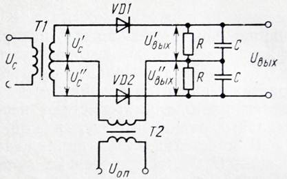 Рисунок 2.4 – Схема балансного фазового детектора Напряжение детектируемого сигнала Uc подводится с помощью трансформатора Т к диодам VD1 и VD2 со взаимно противоположными фазами, т. е. напряжения U'c и U"c противофазны. Опорное напряжение U оп подводится к диодам в одинаковой фазе. Как следует из рис. 7.36, балансный ФД представляет собой сочетание двух простейших ФД, показанных на рис. 7.34. Выходные напряжения U' вых и U" вых имеют взаимно противоположные знаки, а общее выходное напряжение равно разности напряжений U' вых и U" вых. Полагая коэффициенты передачи детекторов на диодах VD1 и VD2 одинаковыми и равными K д, получаем