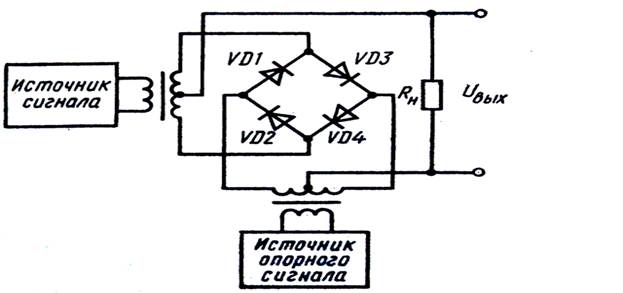 Рисунок 2.6 – Схема кольцевого балансного фазового детектора Из сравнения схем на рисунке 6.6 и рисунке 6.8 следует, что кольцевой детектор состоит из двух обычных балансных, работающих на общую нагрузку. В кольцевом балансном детекторе токи четных гармоник от каждого из двух балансных детекторов в нагрузке протекают навстречу друг другу и при полной симметрии схемы взаимно компенсируются. За счет этого и достигается меньший уровень нелинейных искажений.