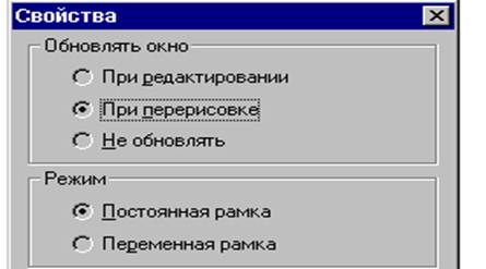 Вікно загального виду викликається на екран за допомогою команди " Вид|окна ". Вікно загального виду призначено для швидкого переміщення по кресленню і відображає все креслення поза залежністю від того, які розміри робочого вікна встановлені у вікні поточного креслення. При роботі з вікном загального виду може бути встановлено два режими. Перемінна рамка. У цьому режимі для переміщення по кресленню Вам необхідно вказувати два кути прямокутної області у вікні загального виду. Для цього підведіть курсор до вікна загального виду, натисніть ліву клавішу миші і, утримуючи її натиснутої, перемістите мишу так, щоб курсор, що з'явився, у виді "гумової нитки" захопив потрібну частину креслення, і відпустіть клавішу миші. Після цього зазначена область у вікні загального виду виділиться іншим кольором, і відповідна область креслення, пропорційно збільшена, виведеться у вікні поточного креслення. Постійна рамка. При цьому режимі, якщо ви підведете курсор до вікна загального виду, то з'явиться курсор у вигляді прямокутника, що показує область креслення, що ви хочете вибрати. Розмір прямокутника пропорційний розміру вікна поточного креслення. Якщо ви будете утримувати ліву кнопку миші натиснутою і переміщати прямокутник по вікну загального виду, то зображення креслення у вікні поточного креслення буде динамічно змінюватися відповідно до переміщення прямокутника. Керування режимами здійснюється установкою відповідної опції в меню, що викликається натисканням правої клавіші миші, коли курсор указує на вікно загального виду. За допомогою меню можна обновити креслення у вікні загального виду, вибравши опцію " Обновить ", можна видалити вікно загального виду з екрана, вибравши опцію " Спрятать ". Для установки режимів перемальовування вікна загального виду необхідно вибрати в меню опцію " Свойства ". На екрані з'явиться діалогове вікно для установки режиму " Обновление окна ".