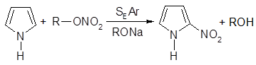 Нитрование пиррола проводят действием алкилнитратов (нитроспирты) в присутствии алкоголятов: