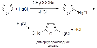 Алкоголяты необходимы для улучшения диссоциации алкилнитратов (генерирование NO2+). · Реакции с солями ртути Фуран и тиофен легко реагируют с солями ртути, образуя меркурпроизводные: