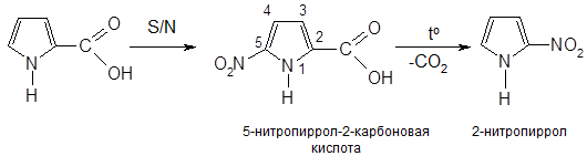 В связи с высокой чувствительностью фурана и пиррола к действию кислотных реагентов, можно проводить реакции SЕ в присутствии защитных групп акцепторного характера. Так, например, пиррол можно нитровать смесью серной и азотной кислот в виде пирролкарбоновой кислоты: