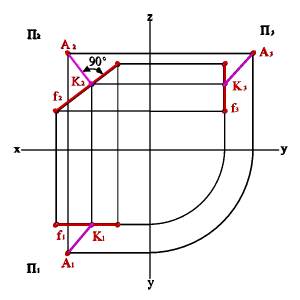 Если прямая параллельна одной из плоскостей проекций т.е. является прямой уровня, то без преобразования ортогональных проекций можно только найти проекции перпендикуляра. Пусть прямая f фронталь, т.е. f \\ П2 значит перпендикуляр можно проводить из проекций А2 к фронтальной проекции прямой m2, на эту плоскость угол будет проецироваться без искажения (рис. 32). Однако полученные проекции отрезка АК не отражают истинной величины отрезка потому, что АК - отрезок прямой общего положения.