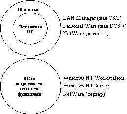 Первые сетевые ОС представляли собой совокупность существующей локальной ОС и надстроенной над ней сетевой оболочки. При этом в локальную ОС встраивался минимум сетевых функций, необходимых для работы сетевой оболочки, которая выполняла основные сетевые функции. Примером такого подхода является использование на каждой машине сети операционной системы MS DOS (у которой начиная с ее третьей версии появились такие встроенные функции, как блокировка файлов и записей, необходимые для совместного доступа к файлам). Принцип построения сетевых ОС в виде сетевой оболочки над локальной ОС используется и в современных ОС, таких, например, как LANtastic или Personal Ware. Однако более эффективным представляется путь разработки операционных систем, изначально предназначенных для работы в сети. Сетевые функции у ОС такого типа глубоко встроены в основные модули системы, что обеспечивает их логическую стройность, простоту эксплуатации и модификации, а также высокую производительность. Примером такой ОС является система Windows NT фирмы Microsoft, которая за счет встроенности сетевых средств обеспечивает более высокие показатели производительности и защищенности информации по сравнению с сетевой ОС LAN Manager той же фирмы (совместная разработка с IBM), являющейся надстройкой над локальной операционной системой OS/2.