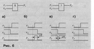 На рис. показана работа элементов И и ИЛИ при подаче на их входы двух последовательных во времени наборов X1 = х1x0 =01 и Х2= х1x0 = 10. Значение сигнала у1 для элемента И на этих наборах должно оставаться постоянным и равным 0, а у2- равным 1. Это выполняется для случаев разброса во времени моментов переключения переменных х1 и x2, показанных на рис. а и г. Если же этот разброс соответствует рис. б и в, то видно, что на выходе схемы И появится логический сигнал 1 длительностью дельта r1, а на выходе схемы ИЛИ - сигнал 0 длительностью дельта r2. Эти ложные сигналы и являются рисками сбоя, причем видно, что они могут быть, а могут и отсутствовать. Все дальнейшие примеры будут иллюстрироваться временными диаграммами для наихудшего случая, когда риск сбоя обязательно имеет место.