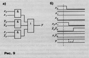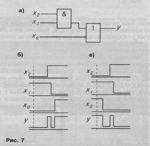 На рис. а приведена схема, реализующая функции у = х2х1+х0. Пусть входной набор X1 = х2x1x0 = 010 изменяется на входной набор X2 = х2х1х0 = 101. На рис. 7, б приведены временные диаграммы, соответствующие наихудшему случаю разброса моментов переключения переменных x2, x1 и x0. Поскольку у(Х1) = 0, а у(Х2) = 1, из рис. 7, б видно, что на выходе схемы многократное переключение вместо идеального алгоритмического перехода 01. Пусть входной набор X1 = х2х1х0 = 011 изменяется на входной набор X2 = х2x1x0 = 100. Из рис. 7, в видно, что вместо идеального алгоритмического перехода 10 на выходе многократное переключение.