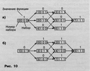 Рассмотрим теперь поведение выходного сигнала той же функции при многоместной смене наборов. Пусть набор 0 переходит в набор 7. Так как все переменные изменяются, а моменты их изменения в общем случае неизвестны, то возможны различные переходы от набора 0 к набору 7 (см. рис. 10, а). Есть единственный путь смены наборов: 0->2->6->7, при котором не будет статического риска сбоя, так как у(Х1=0) = у(Х2=7) = 1. Во всех остальных случаях будет статический риск сбоя в единице S1, причем никакими аппаратными средствами устранить его нельзя, так как значения выхода на промежуточных наборах определяются характером самой функции. По тем же причинам при переходе от набора X1 = 1, на котором у(Х1) = 0, к набору X2 = 6, на котором у(Х2) = 1, возможен путь смены наборов: 1 ->0->4->6, когда имеет место динамический риск сбоя D+, также определяемый характером самой функции. Во всех остальных случаях смены наборов будет чисто алгоритмический переход 01 (см.рис. 10, б). Риски сбоя, проявляющиеся при многоместной смене наборов и определяемые характером самой функции, называются функциональными. Такие риски сбоя не могу быть устранены изменением логической структуры, реализующей булеву функцию.