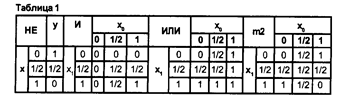 Так как логическая функция задается для троичного моделирования в виде системы булевых уравнений, необходимо определить троичные функции выходов основных булевых элементов НЕ, И, ИЛИ. В табл. 1 приведены выходные сигналы для основных логических элементов, на входах которых действуют трехзначные сигналы.