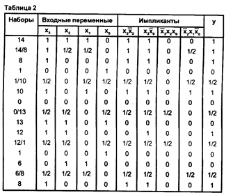 Проанализируем работу схемы, которая реализует функцию у = x3~x2 +x3~x0 + ~x3x2x0 + ~x2x1~x0 для следующих переходов: 14->8; 1->10; 0->13; 12->1; 6->8. Результаты моделирования приведены в табл. 2. Для перехода 14->8 выявлено, что у = 1 на обоих наборах и на переходном векторе, несмотря на наличие S0 на выходе элемента, реализующего простую импликанту ~x2x1~x0. При переходе 1->10 на выходе схемы имеет место чисто алгоритмический переход 01. Для перехода 0->13 выявлен статический риск сбоя в нуле S0. При переходе 12->1 на выходе схемы на переходном векторе обязательно будет сигнал 1/2, так как у(Х1=12) = 1, а у(Х2=1) = 0. Динамический риск сбоя на выходе может проявиться только при наличии статических рисков сбоя на промежуточных сигналах. В нашем случае на простых импликантах x3~x2 и ~x3x2x0 на переходном векторе обнаружен S0, а на импликанте х3~х0 чистый переход 10, следовательно, на выходе в наихудшем случае возможен динамический риск сбоя D-. Аналогично при переходе 6->8 обнаруживается динамический риск сбоя D+.