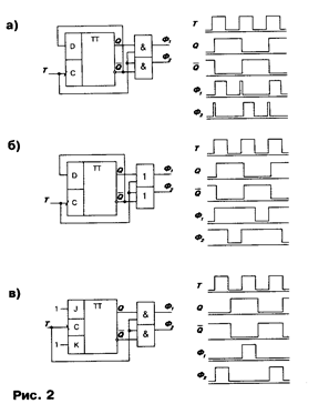 На рис. 2, б комбинационная схема выполнена на вентилях ИЛИ. Из соответствующих временных диаграмм видно, что в этом случае риски сбоя не появляются. Выходные сигналы Ф1 и Ф2 при необходимости можно инвертировать. На рис. 2, в оставлены вентили И, а D-триггер заменен на JK-триггер, срабатывающий по переходу 10 на его тактовом входе. Временные диаграммы показывают на отсутствие в данной схеме рисков сбоя.