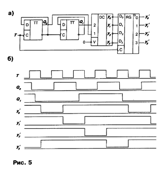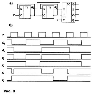 Пример функционального метода устранения рисков сбоя приведен на рис. 6. Здесь используется принцип изменения кодирования последовательных состояний входов комбинационной схемы. В схеме рис. 6, а счетчик изменяет свои состояния не в естественной двоичной последовательности 0-1-2-3, а в последовательности 0-1-3-2, когда в каждом такте изменяется состояние только одного разряда счетчика (здесь используется двухразрядный счетчик Джонсона - сдвиговый регистр с одной перекрестной связью). Из рис. 6, б видно, что в данном случае риски сбоя на выходах дешифратора отсутствуют.