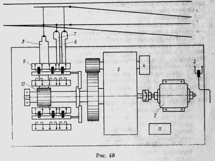 На станциях с электрической централизацией перевод стрелок, затирание и контроль их положения осуществляется с помощью электроприводов, управляемых с центрального поста. Стрелочный электропривод в соответствии с требованиями ПТЭ должен обеспечивать: перевод стрелок с ходом остряков 164 мм;' (плотное 'прилегание прижатого остряка к рамному рельсу и его замыкание при зазоре между остряком и рамным рельсом не более 4 'мм;. отведение отжатого остряка от рамного рельса не менее чем на 125 мм; замыкание остряков стрелки; контроль взреза и перевода стрелки, когда ее остряки находятся на расстоянии 4 мм и более от рамных рельсов. 'Стрелочные электроприводы классифицируются по следующим признакам: типу электродвигателя — постоянного или переменного тока; (времени перевода — нормальнодействующие с временем перевода 2—6с, быстродействующие — до 1 с; способу замыкания — внутренний и внешний; фиксации взреза — взрезной, невзрезной (взрез стрелки— принудительный её перевод под воздействием скатов подвижной единицы, движущейся в пошерстном направлении). В конструкции взрезного привода предусматривается взрезное устройство, предотвращающее поломку привода при взрезе стрелки. Отсутствие взрезного устройства упрощает конструкцию привода и повышает его эксплуатационные ка чества, но при взрезе стрелой происходит поломка его частей. На крупных и промежуточных станциях применяются невзрезные электроприводы титов СП-2Р и СП-3. Электропривод имеет одну рабочую линейку для перевода остряков стрелки и две контрольных для контроля каждого остряка в отдельности. Механизм электропривода и двигатель помещаются в литой чугунный корпус, закрываемый крышкой и запираемый замком. Невзрезной привод осуществляет нераздельный перевод обоих остряков стрелки и их замыкание. Электропривод устанавливается на стрелке на специальной гарнитуре с раздельным креплением контрольных и рабочих тяг. На рисунке 18 представлена блок-схема электропривода типа ОП-3. Электропривод состоит из следующих частей: корпуса 1, электродвигателя 2, редуктора 5, фркционной муфты 4, блока автопереключателя 9, рабочей линейки-шибера 8, главного вала с шиберной шестерней 10, (контрольных линеек 6 м 7, обогревательного элемента 11, блокировочной заслонки с контактом 3.