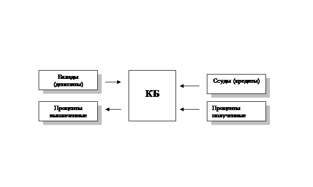 Как и во всех видах коммерческой деятельности, прибыль банка рассчитывается как разность между его доходами и расходами. Банк привлекает средства вкладчиков, кредиторов и выплачивает им процентный доход. Размещая эти средства, он сам получает проценты или другие формы дохода. КБ размещает не только привлеченные, но и собственные средства, которые являются для него бесплатным кредитным ресурсом. Если предположить, что КБ только принимает депозиты и выдает кредиты, формирование его прибыли будет выглядеть так, как на рис. 1.3. Рис. 1.3. Формирование прибыли коммерческого банка