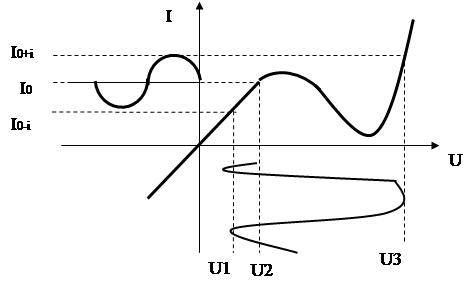 время tвос (время восcтоновления) в течение которого обратный ток изменяется от max до установившегося называется временем восстановления обратного сопротивления (или тока) диода. Это важный параметр импульсных диодов, обычно tвос меньше десятых долей мкс. Туннельные диоды. Туннельным диодом называется полупроводниковый диод,сконструированный на основе полупроводника с большим содержанием примеси, в котором при обратном и небольшом прямом напряжении возникает туннельный эффект, и вольт-амперная характеристика имеет участок с отрицательным дифференциальным сопротивлением. rдиф=dU/dI обозначается: