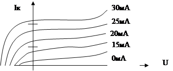 Iэ=Iк+Iб В р-n-p транзисторе ток создается преимущественно дырками, а в n-p-n - электронами. Величина Uэб имеет небольшое значение, близкое к высоте потенциального барьера, и составляет доли вольт. Величина Uкб по крайней мере на порядок больше напряжения Uэб и ограничивается лишь напряжением пробоя коллекторного перехода. При включении источников питания Uэб и Uкб потенциальные барьеры эмиттерного перехода снижаются за счет Uэб, а потенциальный барьер коллекторного перехода повышается за счет Uкб. Дырки эмиттера легко преодолевают понизившийся потенциальный барьер и за счет диффузии инжектируются в базу, а электроны базы в эмиттеры по той же причине. Дырки эмиттера диффузируют в базе к направлению коллекторного перехода за счет перехода плотности дырок по длине базы (1). большинство из них доходят до коллекторного перехода, а незначительная часть рекомбенируется с электронами базы. Для уменьшения потерь дырок на рекомбинацию, базу делают тонкой. Поскольку поле коллекторного перехода для дырок является ускоряющим, они оттягиваются через коллекторный переход коллекторами, тоесть происходит экстракция дырок в коллектор. Распространяясь вдоль коллектора за счет перепада плотности дырки достигают контакта коллектора и рекомбинируют с электронами подходящими к выводу от источника. Основные носители заряда коллекторов (дырки), вследствие того, что потенциальный барьер коллекторного перехода велик, практически не могут уйти из коллектора в базу. Через транзистор происходит сквозное скольжение дырок от эмиттера через базу к коллектором, и лишь незначительная часть их из-за рекомбинации с электронами базы не доходить до коллектора. часть с дырками эмиттера восполняется электронами источника которые поступают в базу через ее вывод. Наряду с основными носителями заряда через эмиттерный и коллекторный переходы движутся и неосновные для каждой из областей носителей, особенно через коллекторный переход: дырок базы в коллектор; и электронов коллектора в базу. Их количество растет с повышением температуры. Таким образом, токи с цепей эмиттера передаются в цепь коллектора с коэффициентом a в такой зависимости: a=Iк/Iэ, где коэффициент a называется коэффициент передачи тока эмиттера в коллектор. В современных тр-рах a бывает равна: a= 0,95¸0,99 и даже больше, но всегда меньше 1. В зависимости от полярности напряжения приложенного к эмиттерным и коллекторным переходам транзистора, различают 4 режима его работы. 1. Активный режим. На эмиттерный переход подано прямое напряжение, а на коллекторный - обратное. Он является основным режимом работы коллектора. Из-за того, что напряжение в цепи коллектора значительно превышает напряжение, подведенное к эмиттерному переходу, а токи в цепях эмиттера и коллектора практически равны, то мощность полезного сигнала на выходе из схемы (коллекторной цепи) на много больше, чем во входной (эмиттерной) цепи транзистора. 2.Режим отсечки. К обоим переходам проводятся обратные напряжения. Поэтому через них проходит лишь незначительный ток, обусловленный движением неосновных носителей заряда. Практически транзистор в режиме отсечки заперт. 3. Режим насыщения. Оба перехода находятся под прямым напряжением. Ток в выходной цепи транзистора максимален, и практически не регулируется током входной цепи. Транзистор, упр