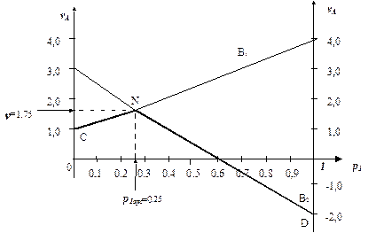 Рис. 2.7 В данной игре нижняя цена игры a=1 не равна верхней цены игры b=3, поэтому игра не имеет седловой точки и, в соответствии с основной теоремой матричных игр, имеет оптимальное решение в смешанных стратегиях. Для игрока А, в соответствии с формулами (2.15) и (2.16), оптимальные вероятности применения стратегий А1 и А2 равны: