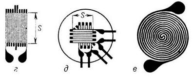 Решетка проволочного тензорезистора может состоять из параллельных петель «а», витков плоской катушки «б», параллельных нитей с перемычками из более толстого провода «с». Материал – проволока или фольга. Диаметр провода решетки 0,015—0,05 мм, минимальная база датчика S = 2 мм, предел измеряемых деформаций 1%, номинальное сопротивление 50—1000 Ом
