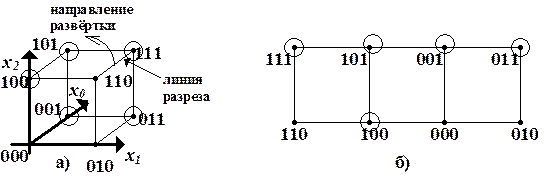 На рис.7а) изображена модель функции трёх переменных в трёхмерном пространстве, а на рис.7б) - в двумерном пространстве на развёртке единичного куба на плоскость. Отметим чрезвычайно важное для практики свойство геометрической модели ФАЛ, на которой видно, что наборы переменных, отличающиеся по одной переменной принадлежат одному ребру единичного куба. Такие наборы переменных называются соседними. На развёртке соседними являются наборы, расположенные на противоположных краях. Сопоставляя геометрические модели ФАЛ двух переменных и ФАЛ трёх переменных, сформулируем правило построения развёрток на плоскость n - мерных единичных кубов (карт Карно) по имеющимся развёрткам n-1 - мерных единичных кубов (карт Карно меньшей размерности). Если строится карта Карно для нечётного количества переменных в наборе, то на расстоянии единицы слева от исходной карты для чётного количества переменных изображается повёрнутая на 1800 вокруг оси, проходящей между исходной и новой картами, новая карта той же размерности. После этого в старшем разряде двоичных кодов наборов исходной карты добавляются незначащие нули, а в старшем разряде новой карты добавляются единицы. Эти две карты объединяются в одну большей размерности. Если строится карта Карно для чётного количества переменных в наборе, то на расстоянии единицы снизу от исходной карты для нечётного количества переменных изображается повёрнутая на 1800 вокруг оси, проходящей между исходной и новой картами, новая карта той же размерности. После этого в старшем разряде двоичных кодов наборов исходной карты добавляются незначащие нули, а в старшем разряде новой карты добавляются единицы. Эти две карты объединяются в одну большей размерности. В картах наборы переменных, на которых функция принимает единичные значения, помечаются нечисловыми символами. Карта с нанесёнными на ней значениями ФАЛ называется диаграммой. Карты, на которых коды наборов изображаются в восьмеричной системе счисления, называются картами Вейча. На рис.8 приведены примеры построения карт Карно и Вейча для четырёх- и пятиместных наборов переменных. На картах Вейча на рис.8б) и рис.8в) дана аналитическая разметка, указывающая области нулевых значений переменных в наборах. На картах в соседних клетках размещены коды наборов переменных, являющихся соседними, т.е. отличающимися по какой-то одной переменной знаком инверсии. На рис.9 приведена геометрическая модель частично определённой ФАЛ пяти переменных в виде диаграммы Вейча. Те восьмиричные коды наборов переменных, на которых ФАЛ имеет единичное значение, отмечены кружком. Те восьмиричные коды наборов переменных, на которых ФАЛ не определена отмечены круглыми скобками. В большинстве технических применений функции алгебры логики являются частично определёнными, так как не существует технической возможности появления некоторых наборов переменных, называемых в этом случае запрещёнными. На рис.9 отмечены поля из соседних пар наборов переменных, на которых ФАЛ не определена или имеет единичные значения.
