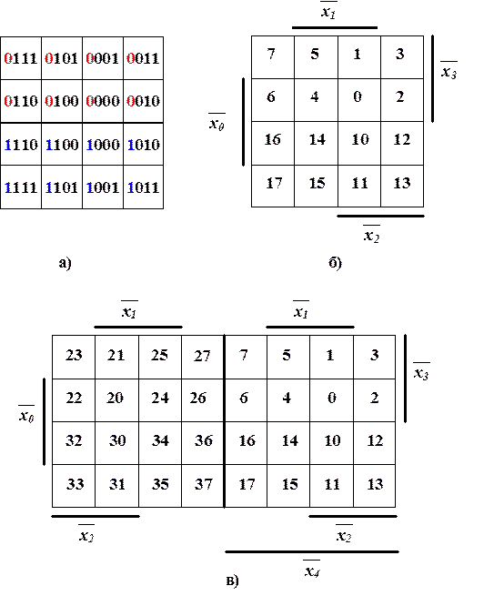 Рис.8. Пример построения карт Карно и Вейча для четырёх- и пятиместных наборов переменных