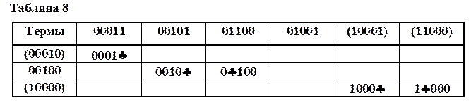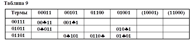 В ячейках таблицы 8 находятся импликанты группы 1, в ячейках таблицы 2 находятся импликанты группы 2, в ячейках таблицы 3 находятся импликанты группы 3. В таблицах 11 и 12 произведено сопоставление импликант соседних групп.