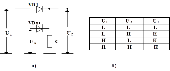 Схема логического элемента ИЛИ, построенного на полупроводниковых диодах и резисторе, приведена на рис.12а).
