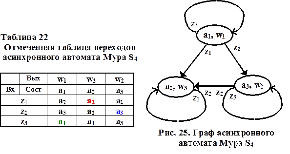 Состояние as автомата S называется устойчивым состоянием, если для любого входа zfÎX, такого, что d(am, zf) = as, имеет место d(as, zf) = as. Это означает, что если автомат перешёл в некоторое состояние под действием zf, то выйти из этого состояния он может только под действием другого, отличного от zf сигнала. Автомат S называется асинхронным, если каждое его состояние as ÎA - устойчиво. Автомат S называется синхронным, если он не является асинхронным. Созданные для практических применений цифровые автоматы всегда являются асинхронными, а устойчивость их состояний всегда обеспечивается тем или иным способом, например, введением сигналов синхронизации. Таким образом, оказывается, что техническая терминология противоречит математической терминологии, так как, согласно приведённым выше определениям, синхронизированные (технический приём) цифровые автоматы всегда являются асинхронными (математическое определение). На уровне абстрактной теории, когда цифровой автомат - всего лишь математическая модель, не отражающая многих конкретных особенностей его возможной реализации, часто оказывается более удобным оперировать с синхронными цифровыми автоматами. Пример асинхронного цифрового автомата Мура S4 приведён в отмеченной таблице 22, а его граф - на рис.25. Очевидно, что все его состояния устойчивы. Если в таблице переходов асинхронного цифрового автомата некоторое состояние as стоит на пересечении строки zf и столбца am (m ¹ s), то это же состояние as обязательно должно встретиться в этой же строке в столбце as. В графе асинхронного цифрового автомата, если в некоторое состояние as имеются переходы из других состояний под действием каких-то сигналов, то в вершине as должна быть петля, отмеченная символами тех же входных сигналов.