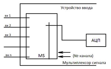 N внешних входов подключается к АЦП через мультиплексор сигналов (MS). На MS поступает код номера входного канала в соответствии с которым подключается канал к входу АЦП. Частота оцифровки: