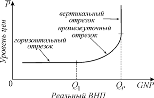 Совокупное предложение (AS) – это общая величина всех конечных товаров и услуг, предъявляемых к продаже, т.е. это реальный объем национального производства при каждом возможном уровне цен. Более высокий уровень цен стимулирует увеличение объема предложения (производства), более низкий – сокращение производства, т.е. между уровнем цен и национальным объемом производства существует прямая зависимость (рис. 3).
