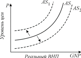 Рис. 4. Смещение кривой совокупного предложения под воздействием неценовых факторов Если, например, повышаются цены на ресурсы (растет цена нефти), при неизменной технологии издержки производства возрастут. Тогда при каждом уровне цен, совокупное предложение будет сокращаться – кривая AS сместится влево, в положение AS 1. Соответственно, падение цен на ресурсы приведет к увеличению предложения и смещению кривой AS вправо до AS 2. Выводы 1. Совокупный спрос формируется всеми субъектами рыночной экономики (домашние хозяйства, фирмы, правительство) и зависит от общего уровня цен. Обратная зависимость между общим уровнем цен и спросом на реальный ВНП объясняется действием эффекта процентной ставки, эффекта богатства, эффекта импортных закупок. Наряду с ценами на совокупный спрос воздействует ряд неценовых факторов. Изменение цен ведет к движению по кривой, изменение совокупного спроса под влиянием неценовых факторов приводит к сдвигам кривой совокупного спроса. 2. Зависимость между общим уровнем цен и объемом реального ВНП, который может быть предложен (произведен) при каждом уровне цен, описывается кривой совокупного предложения. Форма кривой совокупного предложения отражает динамику издержек производства. При наличии свободных ресурсов, в частности при высоком уровне безработицы, предприниматели могут расширить производство без изменения издержек производства и, следовательно, цен. Напряженность на рынке труда заставляет предпринимателей повышать заработную плату, что ведет к увеличению издержек производства, и расширение производства сопровождается ростом цен. При полном использовании ресурсов (естественном уровне безработицы) ВНП достигает своего потенциального уровня и дальнейшее расширение производства при данных ресурсах и неизменной технологии невозможно. На вертикальном отрезке кривой совокупного предложения расти могут только цены. На динамику совокупного предложения, кроме цен, влияют неценовые факторы (цены на ресурсы, производительность ресурсов, уровень налогообложения производства и др.). Под воздействием этих факторов происходят смещения кривой предложения.