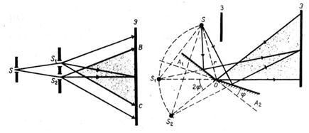 §1.2. Получение когерентных пучков делением волнового фронта. Метод получения когерентных пучков делением волнового фронта (он пригоден для достаточно малых источников) заключатся в том, что исходящий из источника пучок делится на два, например, проходя через два близко расположенных отверстия, либо отражаясь от зеркальных поверхностей и т.д.